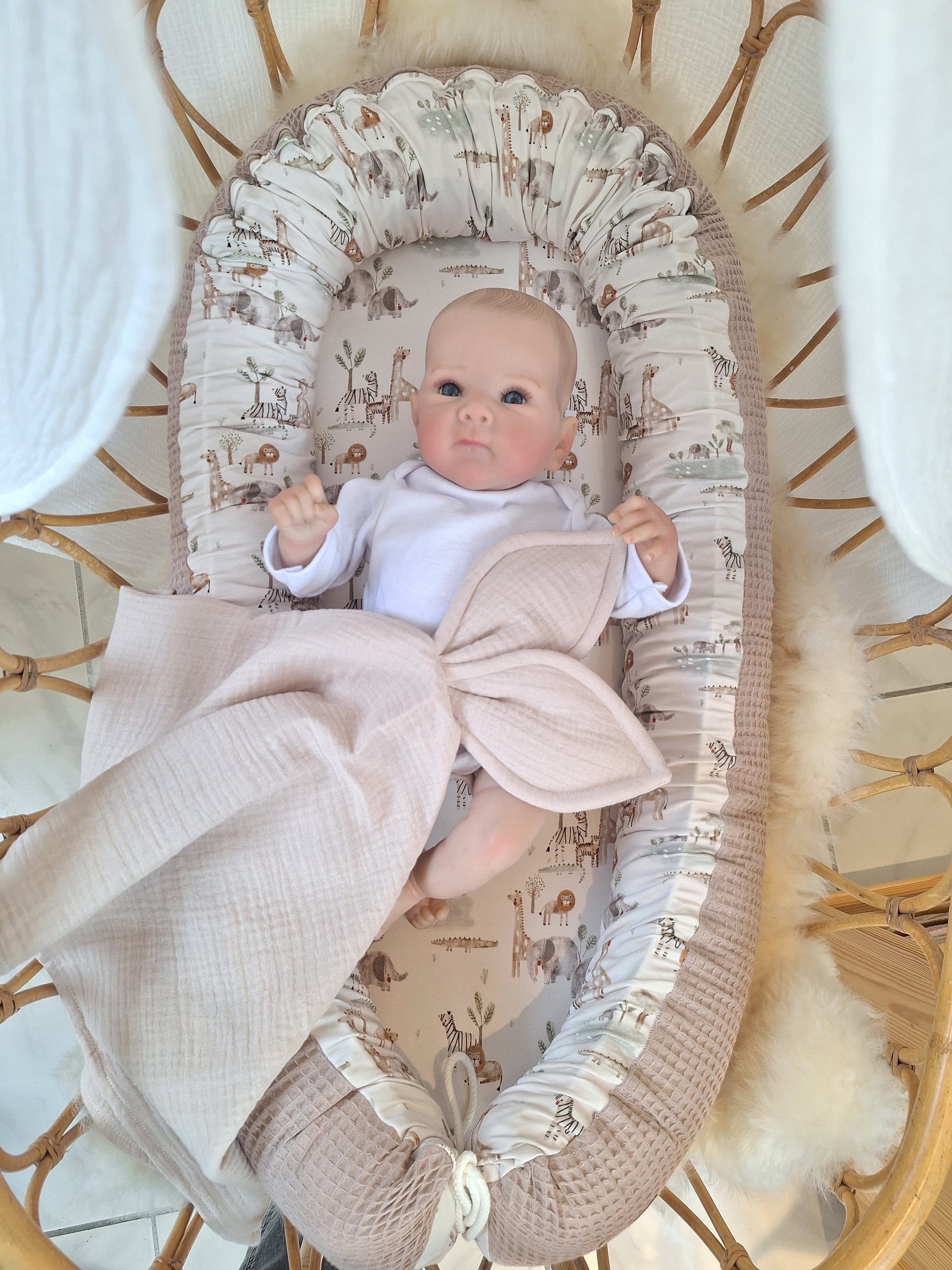 Achten sie bitte immer darauf dass die Bänder am Cocoon nicht zu lange sind und diese ihr Kind nicht öffnen kann. (Bänder werden nach Produktion auf das Minimalste von uns gekürzt).